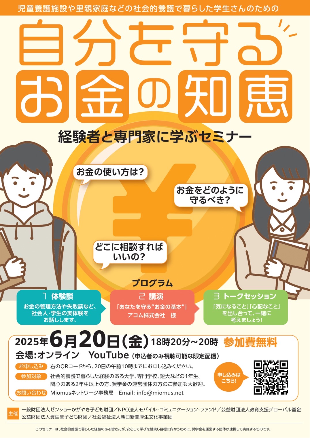 ビヨンドトゥモローのほか、社会的養護の下に暮らす若者を応援する複数の団体による共催で、児童養護施設や里親家庭など、社会的養護で暮らした経験のある学生を対象に、【自分を守るお金の知恵】セミナーを開催します。