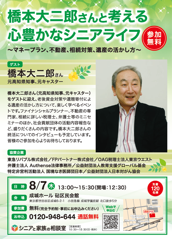 高知県知事やキャスターとしての経験を持つ橋本が、これからの人生を豊かに生きるためのヒントを、ファイナンシャルプランナー・税理士・弁護士などの専門家とともにお話しします。