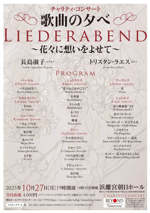 ソプラノ歌手の長島淑子氏が、ビヨンドトゥモローの活動に賛同いただき、チャリティコンサートを開催していただけることになりました。このチケットの半額を、困難な状況にある若者への支援にご寄付いただきます。ぜひご参加ください。